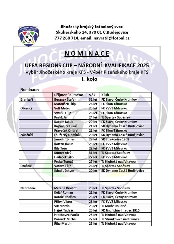 Vážený pane předsedo, vážený trenére, dovoluji si Vás oslovit jménem Jihočeského krajského fotbalového svazu ve věci konečné nominace hráčů z Vašeho klubu do výběru Jihočeského kraje. Ve středu 17. září 2025 od 18:30 v Písku odehraje náš krajský výběr prestižní utkání proti výběru Plzeňského kraje v rámci UEFA Regions Cup. Toto utkání je výjimečnou příležitostí nejen pro samotné […]