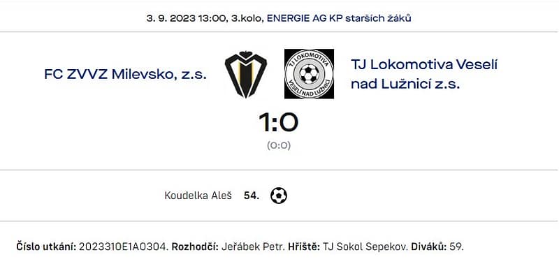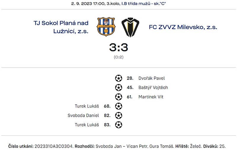 Petřík Daniel (penalta) 16. Dobal Vladimír 27. Gondek Tomáš 49. Petřík Daniel 67. Petřík Daniel (penalta) 72. Číslo utkání: 2023310A1A0406. Rozhodčí: Krčn Jan – Brych Jiří, Petričák Daniel. Hřiště: Týn/Vlt.. Diváků: 120. FK Olympie Týn nad Vltavou – FC ZVVZ Milevsko 2:3 (1:1). Branky: 27. Dobal, 49. Gondek – 16. (pen.), 67. a 72. (pen.) Petřík. Rozhodčí: Krčín – Brych, Petričák. ŽK: […]