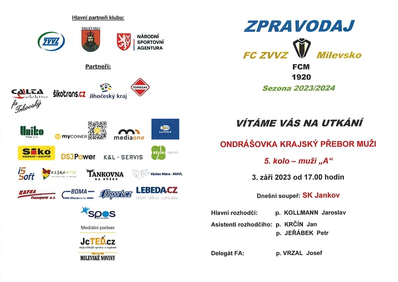 Zpravodaj na nedělní utkání ONDRÁŠOVKA KRAJSKÝ PŘEBOR MUŽŮ 3. září 2023 od 17.00 hod.