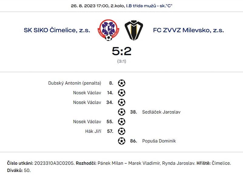 Dubský Antonín (penalta) 8. Nosek Václav 14. Nosek Václav 34. Sedláček Jaroslav 38. Nosek Václav 55. Hák Jiří 57. Popuša Dominik 86. Číslo utkání: 2023310A3C0205. Rozhodčí: Pánek Milan – Marek Vladimír, Rynda Jaroslav. Hřiště: Čimelice. Diváků: 50.