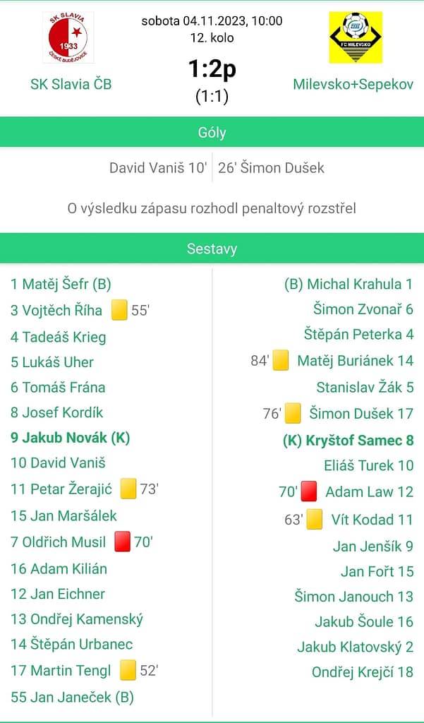 Utkání na Slavii ČB jsme nutně potřebovali zvládnout. Bohužel jsme inkasovali jako první, ale poměrně rychle se nám podařilo zareagovat a po zbytek zápasu jsme byli lepším týmem, ale hru výrazně komplikoval velmi těžký terén na kterém byla nemožná veškerá hra po zemi. Trošku nas mrzí, že to není za 3 body, ale v naší situaci je důležitý i ten bonusový bod za penalty, které kluci zvládli velmi dobře. V příštím a posledním podzimním kole přivítáme Vimperk a chceme podzim zakončit pozitivně a získat další důležitý body.